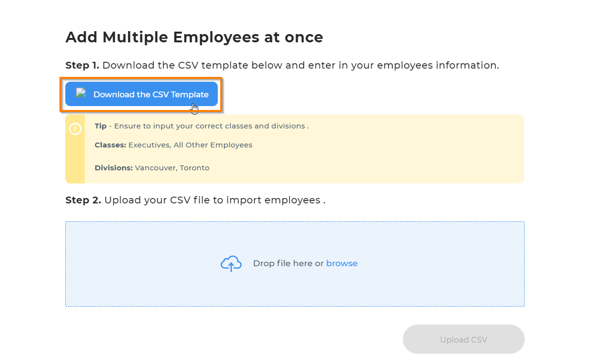 - A pop-up window will appear. Click Download the CSV Template to create a CSV from the list of employees you want to add.