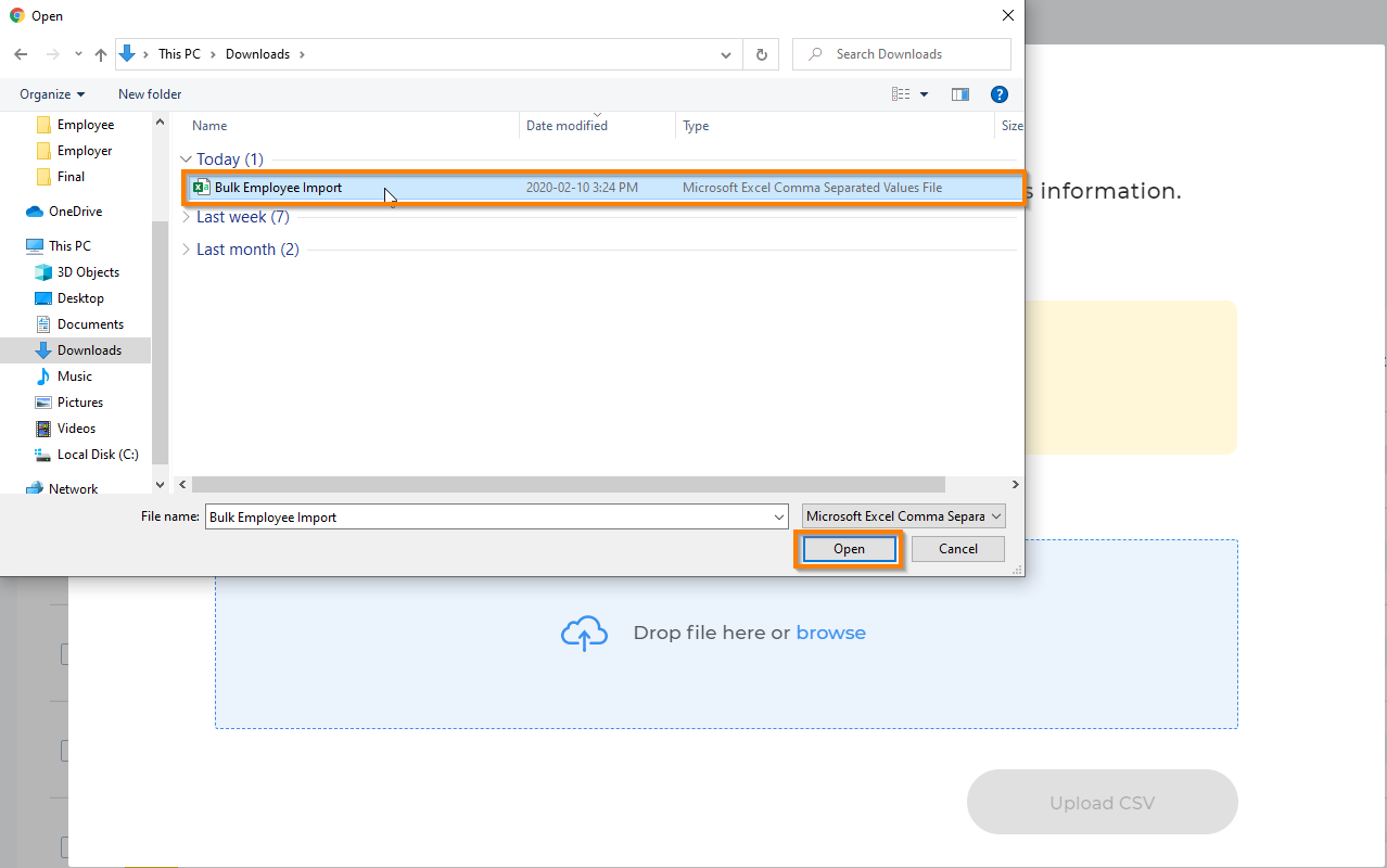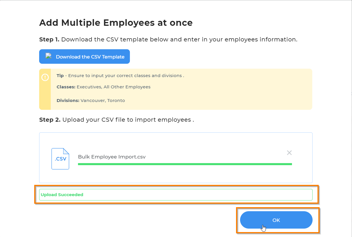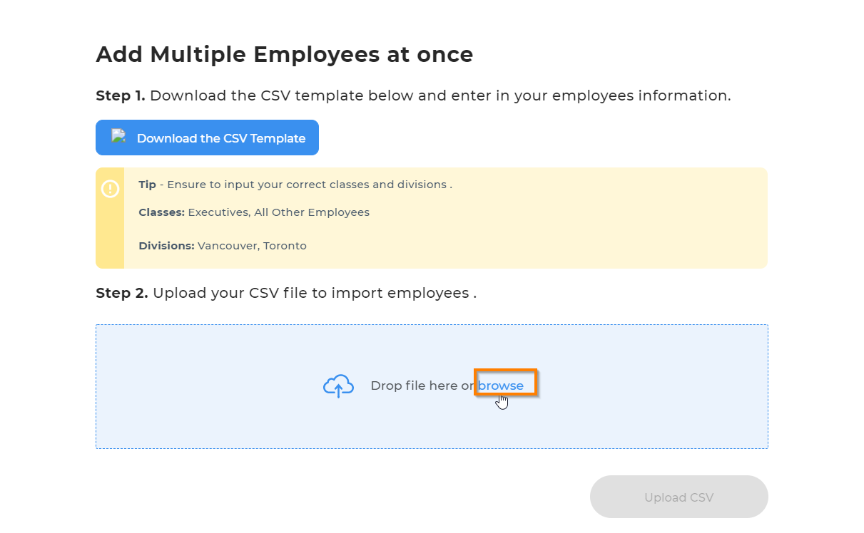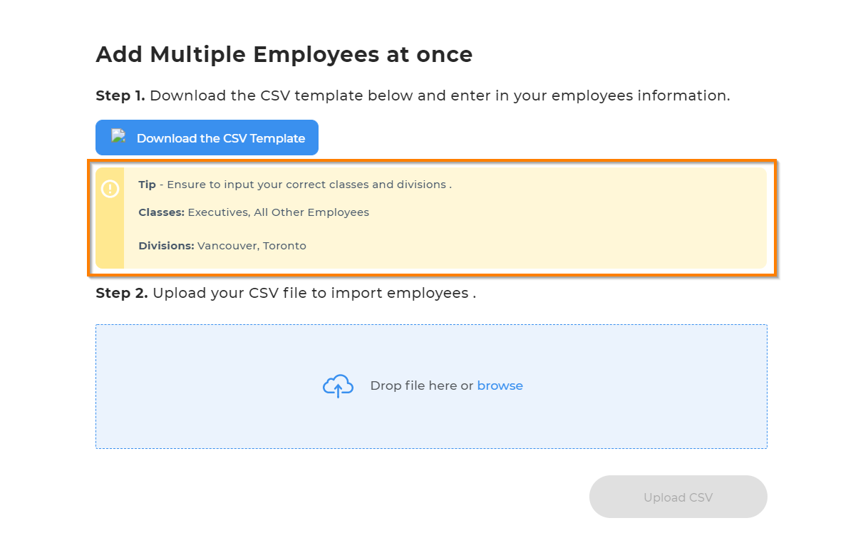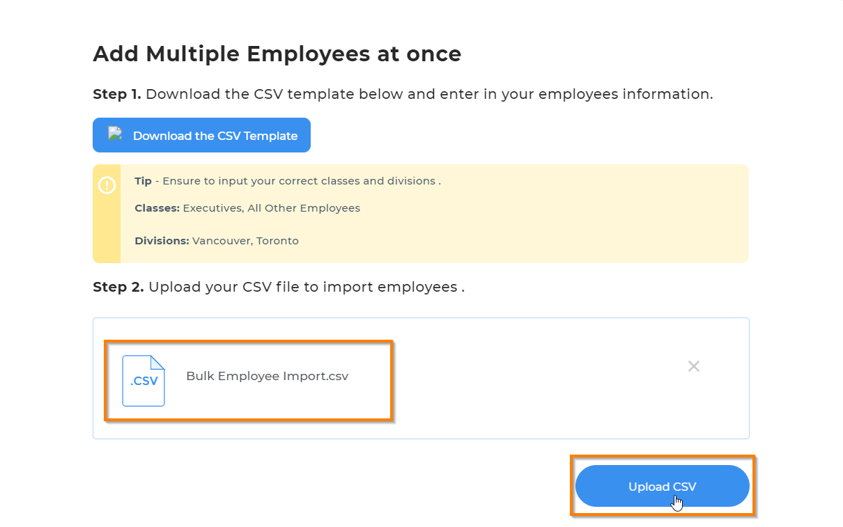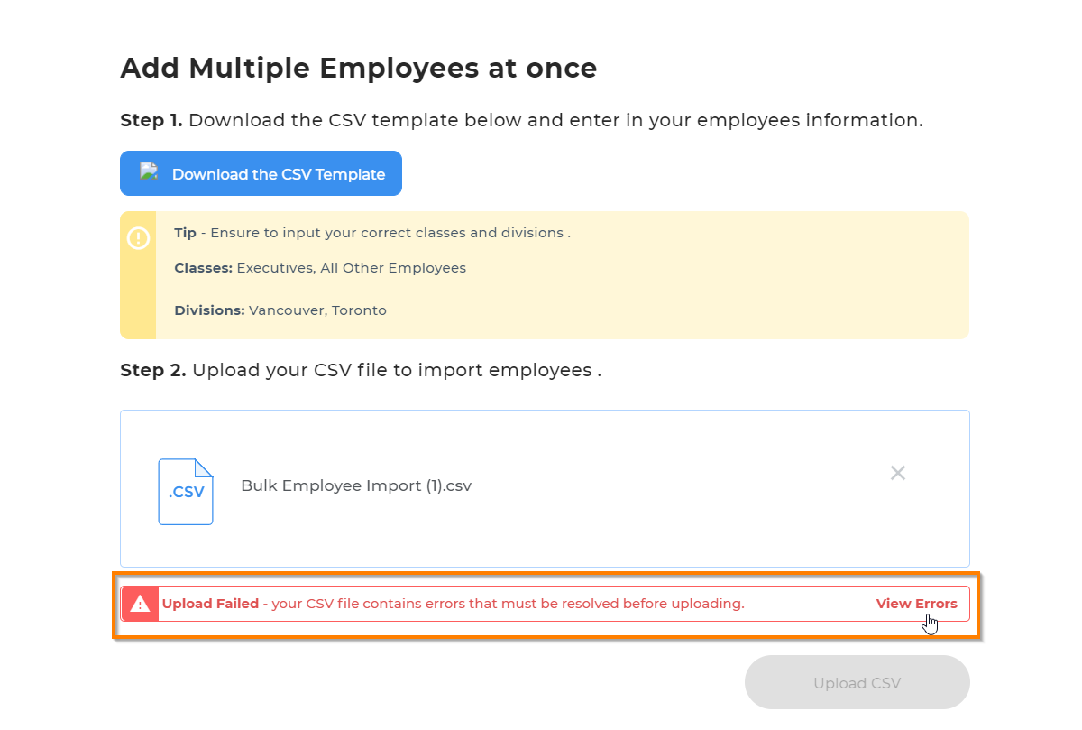 - You can view the CSV file in Step 2. Click Upload CSV to add the employees.