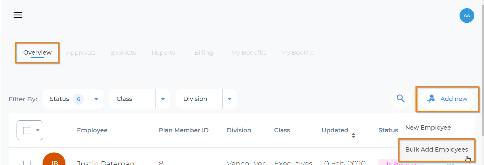 - To add multiple employees, on the top-right corner of the Home Page, click Bulk Add Employees from the Add New drop-down menu.
