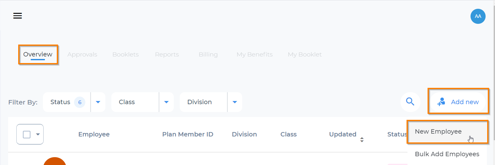 - To add a new employee on the Overview page, from the top-right corner, click New Employee from the Add New drop-down menu.