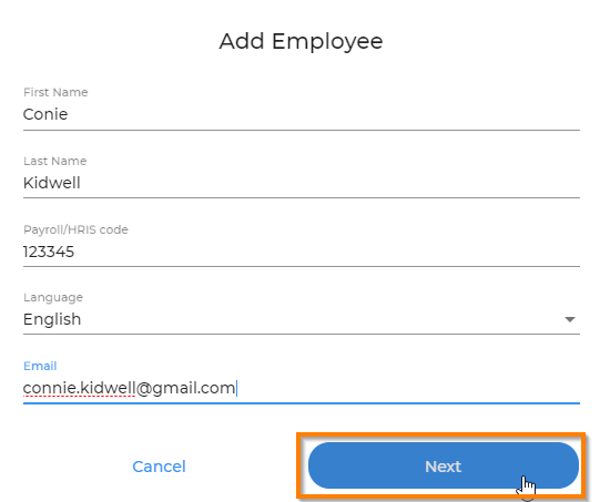 - A pop-up window will appear. Fill in the following details of the employee and click Next: